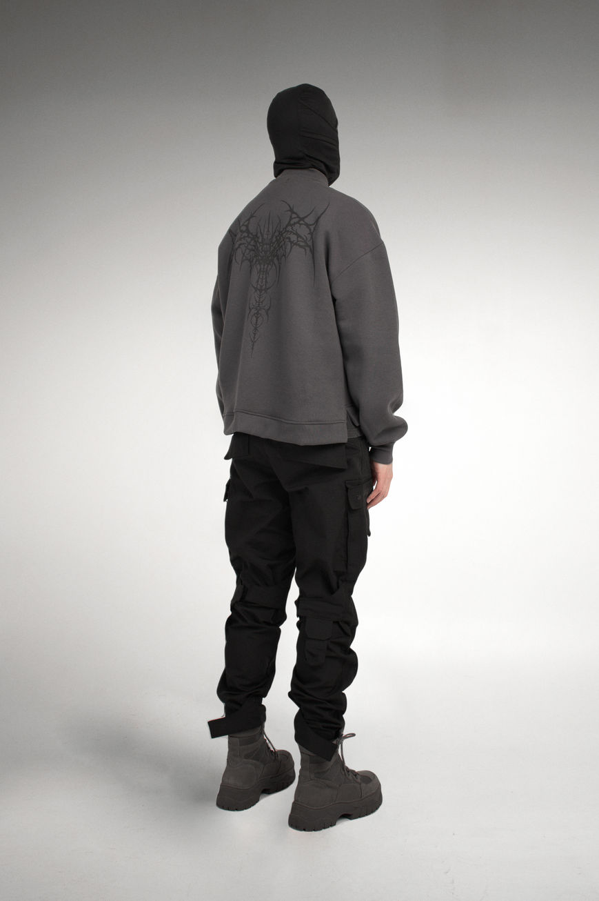 Thick and comfortable oversized mockneck in gray colorway. crafted in our original silhouette. The Sigil has slits on the sides, an extended back & thumbholes in cuffs.